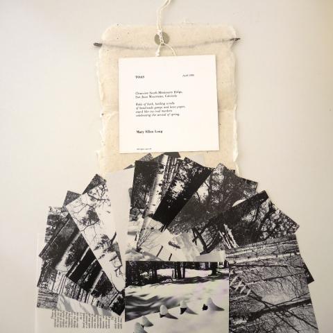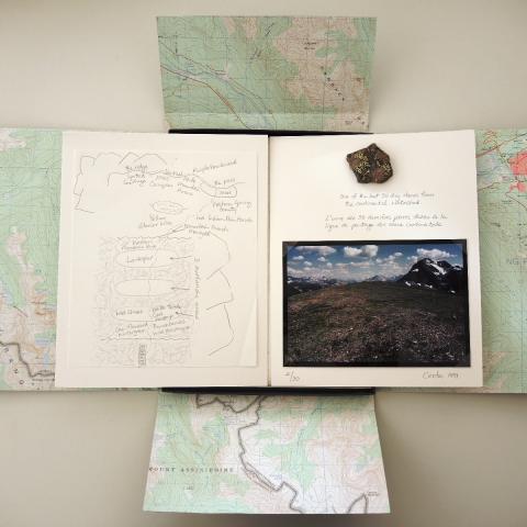 A highlight of the exhibition is a bookwork on loan from artist Peter von Tiesenhausen. Residuum, The Book is a unique work made from aspen ash watercolour on aspen pulp bound with steel strapping, it measures 32 x 32 x 5 inches (when closed). In the film Landscape as Muse: The Forest with Peter Von Tiesenhausen (Season 2, episode 13) by 291 Film Company, the artist describes the process of creating the drawings for the books: “I’m drawing the memories of trees, that particular species of which the pulp is made…so they are memories of trees, done with the ashes of trees, on the residuum of trees.” This monumental and complex work is on view in the library.Spread over four locations on The Banff Centre campus (Library, Sally Borden Building, Max Bell Building, Kinnear Centre) the exhibition consider[s] how the structure, material, and content of [artists’ books] guides their reading. The focus is on Artists' Bookworks by Land Artists, artists whose works are creations on or from the landscape directly. Over the course of more than thirty books […] groupings of bookworks are presented that consider the correlation between the physical action of moving through Landworks with that of reading their Bookworks. – Susan Sax-Willock