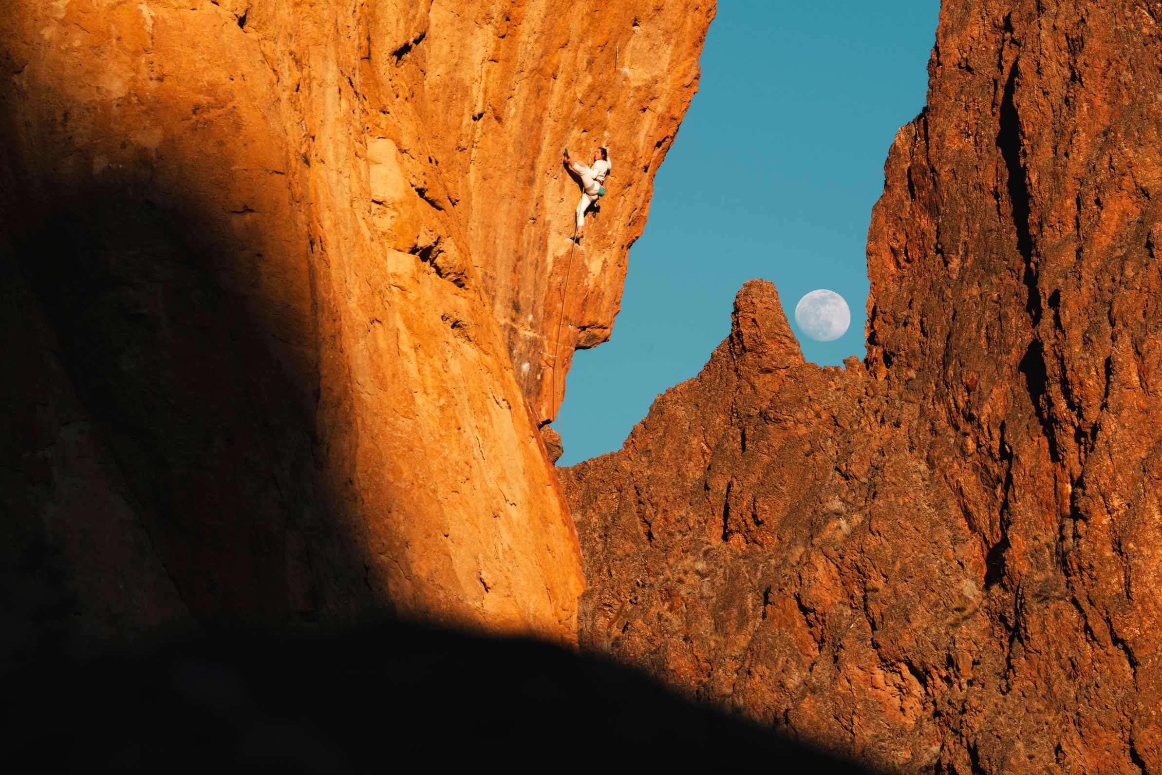 This stellar photo was taken in Smith Rock State Park, Oregon where Jules has climbed extensively. “When you spend a lot of time in one place, you start noticing how it shifts with the seasons, the way the light moves through the pillars of rock and the shadows that stretch across the walls,” says Jules.