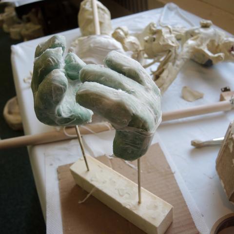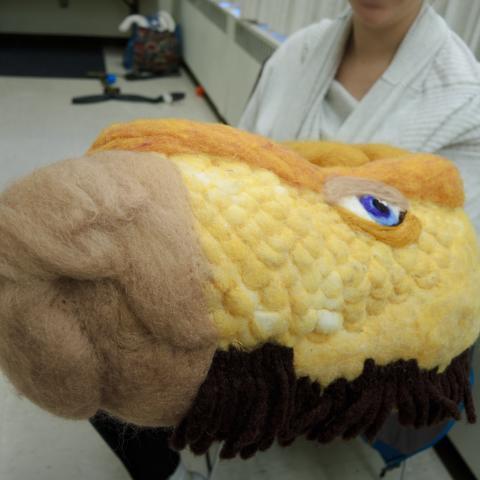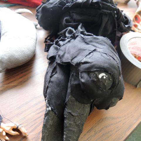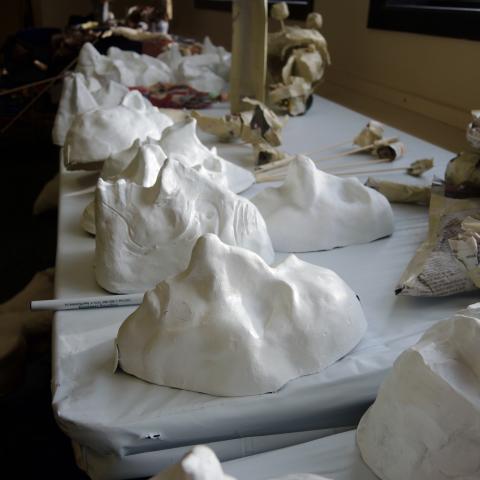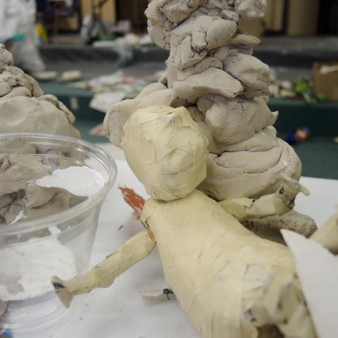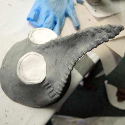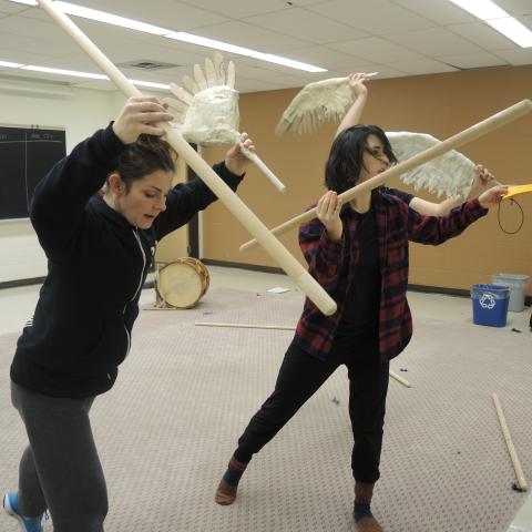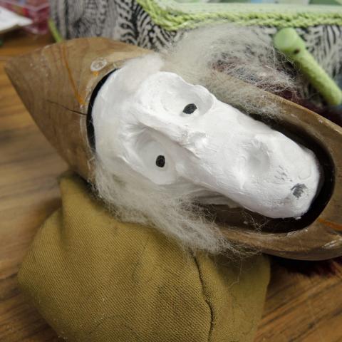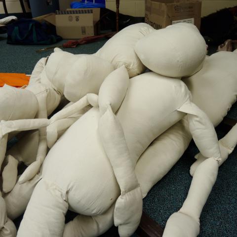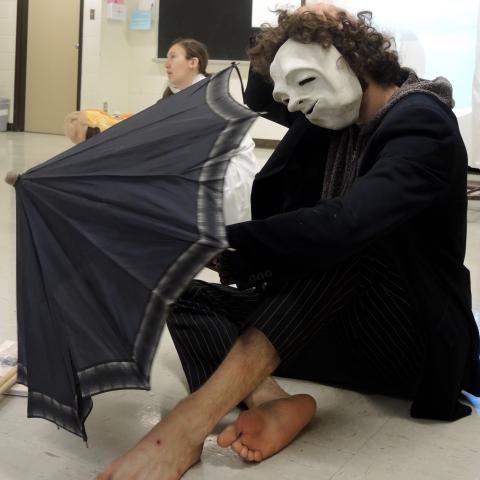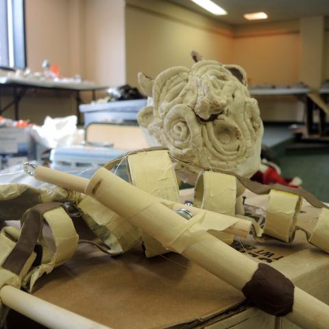 Mysterious things were happening in the Lazlo Funtek teaching wing of the Theatre Complex. The dance studios were filled with clowns doing yoga; suited and be-hatted performers were moving large plush filled dummies through space; dinosaurs roamed the halls, while downstairs a construction space emerged, with a kaleidoscope of materials spawning on every flat surface available, interspersed with sewing machines and power tools.