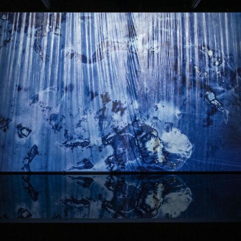 Cassils’ large scale cyanotype, Human Measure (Developed) No. 2, references Klein’s well-known series of paintings, Anthropométries, in which he instructed women to dip their bodies in blue paint and press themselves onto a substrate; a process the artist likened to the use of 'living brushes.' Each body print in the cyanotype is an indexical record from the movements present in the choreography and suggestive of outlines found in ACT UP and Black Lives Matter protests. The forms gesture towards traces of lives lived, while reflecting gentle sensuality, care, and a sense of floating or resting. Produced using an analogue photographic process using UV light and developed live on stage during the performance, the work reverberates the blue hue used extensively by Klein while alchemizing his instrumentalization of female agency into an image of queer collectivity and self-determination. Leaning into abstraction, this piece can simultaneously be read as a protest banner, artwork and performance document.