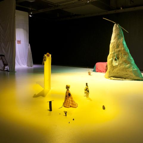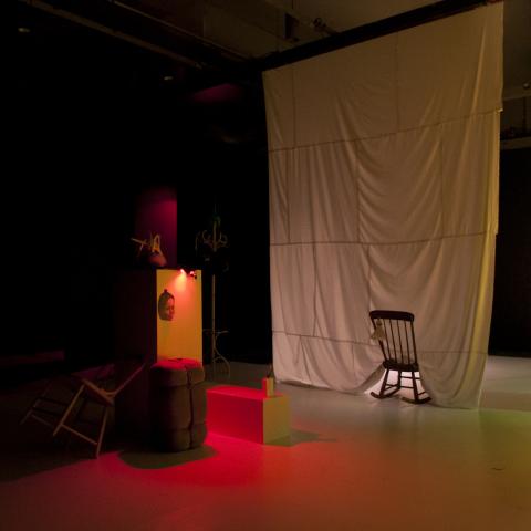 God’s Dice was a “sculpture play” presented by Geoffrey Farmer in association with Theatre of Erosion or I Hate Work That Is Not A Play, a four-week thematic residency that he lead at Banff Centre in 2010. Continuing his interest in time and place, and in art that makes process visible, Farmer created new work with participants in residence. Incorporating props from the Theatre Department, such as mirrors, musical instruments, sculptures, texts and costumes, this conceptual work makes use of chance operations, improvisational methods, and choreographed actions. It is the sum of all these parts that creates a singular narrative, a final story that can only be fully realized at the moment the end is announced.