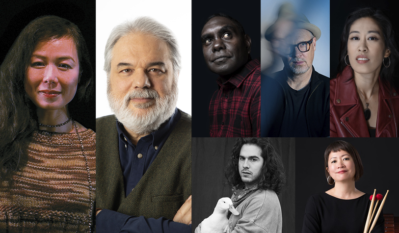 Left to Right: Nguyễn Thanh Thủy. Photo courtesy of the artist. Sandeep Bhagwati. Photo by Alain Lefort. Hand to Earth Trio: Daniel Wilfred, Peter Knight, and Sunny Kim. Photos by Sarah Walker. Bottom Right: Jeremy Dutcher and Haruka Fujii, photos courtesy of the artists.
