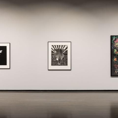 Other works were selected for their relationship to the public art collection situated across Banff Centre's campus, echoing the outdoor works within the exhibition. Tipping Point (2010) by Brian Jungen was produced in relation to the artist's public sculptures, The ghosts on top of my head (2010-11) and speaks to questions of consumption within the National Park while also humorously subverting the nationalist associations of certain local wildlife such as the beaver. A pair of silkscreen prints by August Klintberg, one reading 'meet me in the woods' and the other, 'meet me in the town,' mirror the language of the public works on campus by the artist; the phrases both ambiguous and playful in terms of whom they are meant to address and the purpose of the meeting. A series of photographs that compose a part of the public artwork, Vessel/Enclosure (1996-2043) by Peter von Tiesenhausen annually document the slow degradation of a sculpture in woven willow branches through its natural exposure to the elements, and are paired with a photograph on loan of a similar sculpture on the artist's property in Alberta's Peace Country that has since returned to the earth. Eastern Butterflys '95 (1995) by Mike MacDonald depicts butterfly species from his place of birth in Nova Scotia and is included for its relation to Butterfly Garden (1999); a living artwork by the artist composed of plants selected for their ability to provide refuge for butterfly species that draws on Mi'kmaq and western scientific forms of knowledge. Human and animal relationships are also centred in Jane Ash Poitras' From New York to Banff (2019), which combines image and text referencing the significance of the buffalo in the artist's Cree worldview.