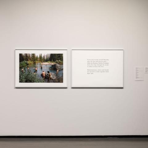 Echoes also form between works which honour another's artistic legacy. In relationship with MacDonald's Butterfly Garden is Soundtrack for the Radical Love of Butterflies (2018) by T’uy't'tanat-Cease Wyss and Anne Riley, a sound work that honours the late artist's practice alongside Indigenous social justice workers and pollinators. Walter J. Phillips' The Vapours Round the Mountain Curled (1938) is exhibited with Vapours After WJP (1998) by Allan Harding MacKay, a part of a series drawing on the imagery of works by other artists; with the pairing previously included in the exhibition,The Odd Couple (2015). In contrast, Diane Borsato's Swimming with Mathematicians (2018) invites future echoes. Depicting artists and mathematicians who joined together for a swim in the river just off Banff's Hoodoos Trail, the diptych also includes a text piece encouraging subsequent acts of sociality each July.