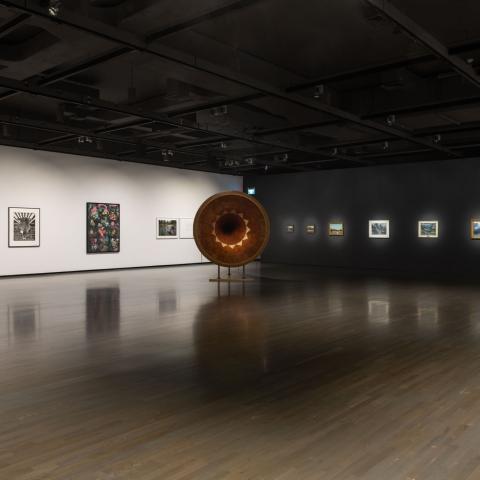 The Shape of an Echo: Selections from the Permanent Collection assembles works from the 1920s to present that centre on questions of land and its representations, primarily focused on artists’ engagements with Banff National Park. Taking inspiration from Rebecca Belmore’s seminal work, Ayum-ee-aawach Oomama-mowan: Speaking to Their Mother (1991), the exhibition invites consideration of how the experience of an echo through repetition and reflection can allow one to situate themselves in relation to land. Titled in Anishinaabemowin and its English translation and produced by the artist in response to the historic land dispute that has become known as the Oka Crisis, in 1992 Belmore's work was activated at gatherings with Indigenous communities and people across the country who were invited to speak to the land through the sculpture; with the edited recordings included in the sound work of the same name. [1] Moving between image, object, and sound, the selection of works are also intended to open readings of potential echoes within and across the collection; be they between the work of faculty and student; made in response to another's artistic legacy; or which take the form of an instruction that invites re-performance, creating future iterations through its design.