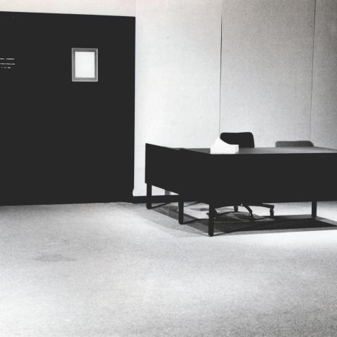For the seminal exhibition Vocation/Vacation in 1981, Garry Neill Kennedy made a spare new installation entitled Simple Functionalism. All that remained in the space was the attendant’s desk, altered to comply with the “Statement of Design Guidelines” issued in 1980 by The Banff Centre Aesthetic Committee. Kennedy’s choice to present an institutional piece of furniture as the only object in the gallery enabled him to reveal the context in which art is produced and displayed. Some visitors were hesitant to enter the installation, doubting whether they were allowed into what appeared to be an empty gallery. Faced with only a transformed desk and its occupant, the audience was confronted with what is traditionally overlooked: the white walls, the flooring, the lighting tracks, and the space itself.