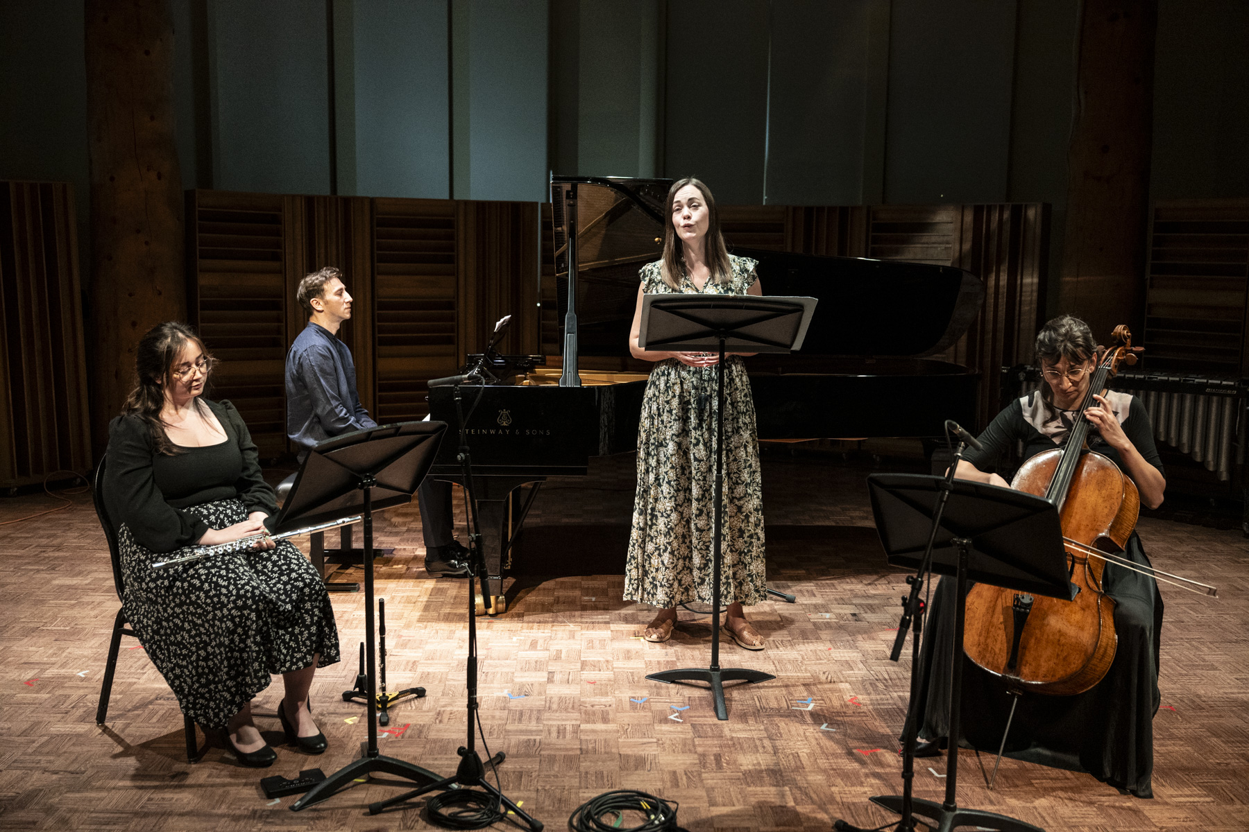 Interplay Faculty Rehearsal, 2025. Nicole Percifield (voice), Katie Kirkpatrick (flute), Caroline Milot (cello), Nikola Markovic (piano), photo by Rita Taylor.