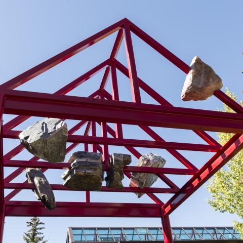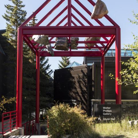 Tyler Los-Jones: Jen Mizuik, the director of Visual + Digital Arts here at The Banff Centre invited me to propose a temporary public work for the red archway entrance outside the Walter Phillips Gallery. To me the red archway reads as this slick representation of the mountains, so I chose to respond to this architecture by producing five fiberglass boulders based on the geology found around Tunnel Mountain. Initially, when I was approached I was on residency at the Gushul Studio in Blairmore, Alberta that had been organized by the Southern Alberta Art Gallery in Lethbridge. The Gushul residency was an amazing opportunity for me to think about where my work was going and to refocus after a series of recent exhibitions.