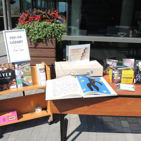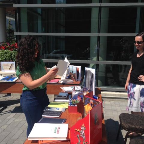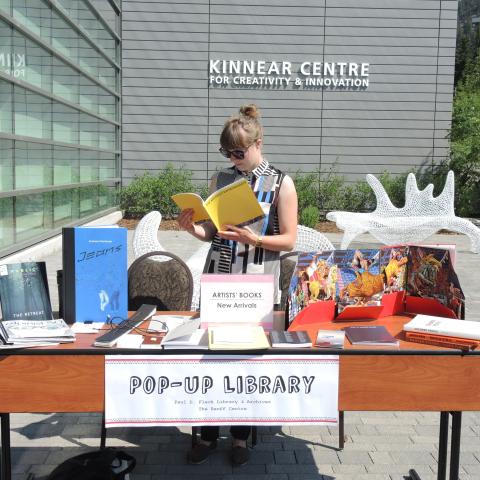 On July 9, 2015, the Paul D. Fleck Library & Archives introduced a new project which brought the library to you, Banff Centre Community! We set our Pop-Up Library in the Canada Plaza of the Kinnear Centre for Creativity and Innovation, where visitors had the opportunity to stop by and explore the wide range of our collections, find out about upcoming library programs, and library staff members were on-hand to take care of any questions at this alternate location.