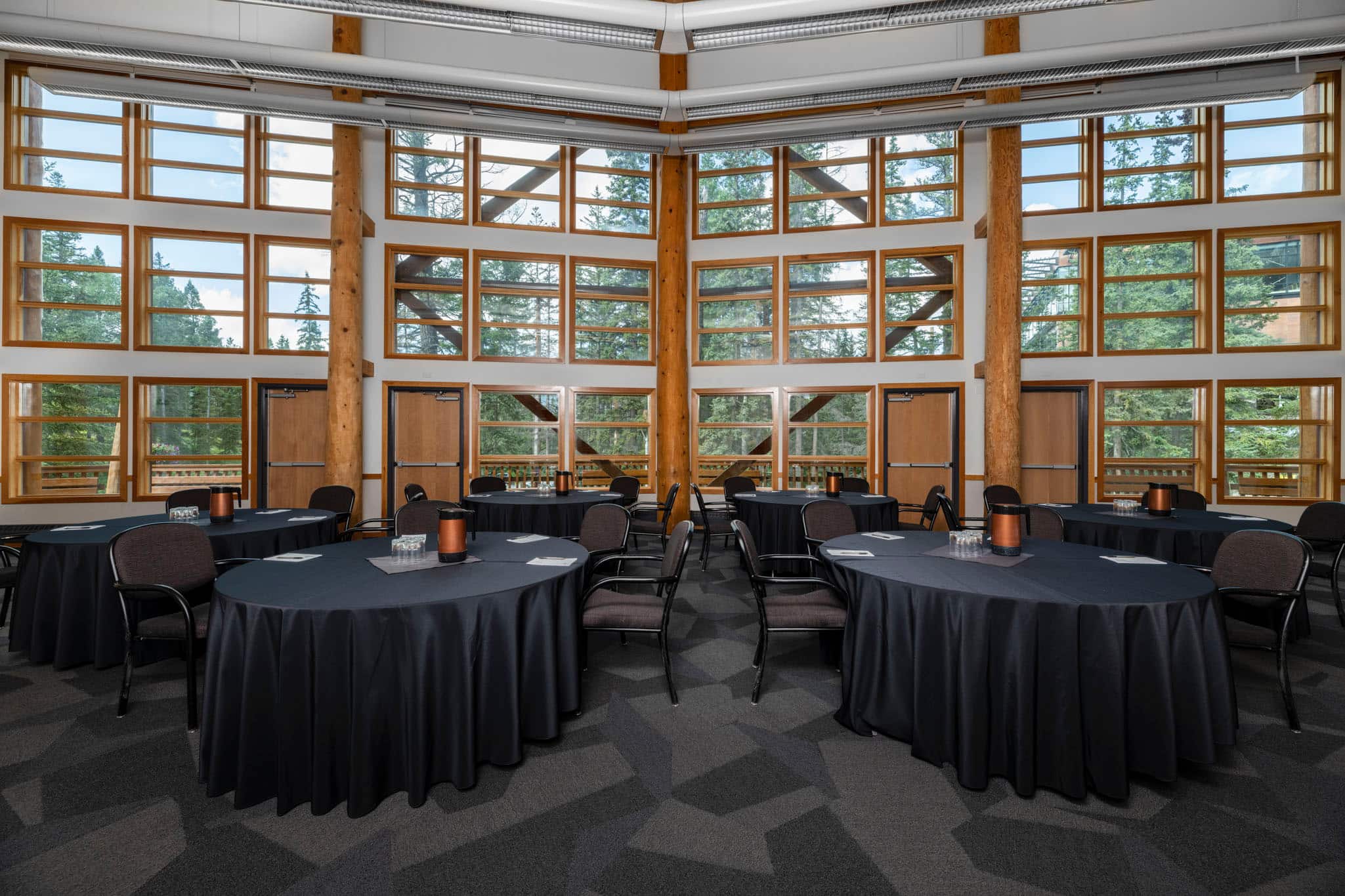 The Professional Development Centre features timber beams, high vaulted ceilings, and curved walls. The meeting spaces are renowned for large floor-to-ceiling windows that welcome in natural light and provide breathtaking views to immerse your attendees into our mountain environment.