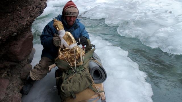 A father and son from the Indian Himalaya embark on a winter pilgrimage along an ancient trail to deliver a heavy bronze Buddha statue to a remote mountain monastery along a route that follows the frozen surface of the Zanskar River through its challenging gorges.