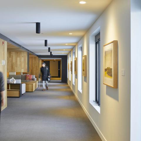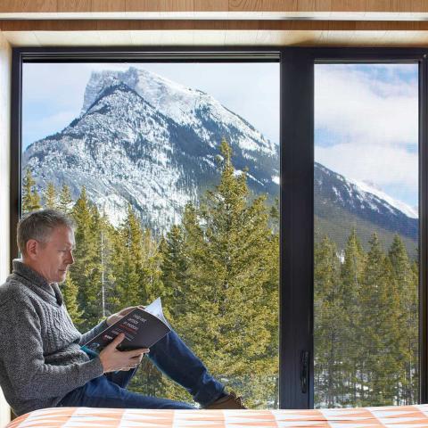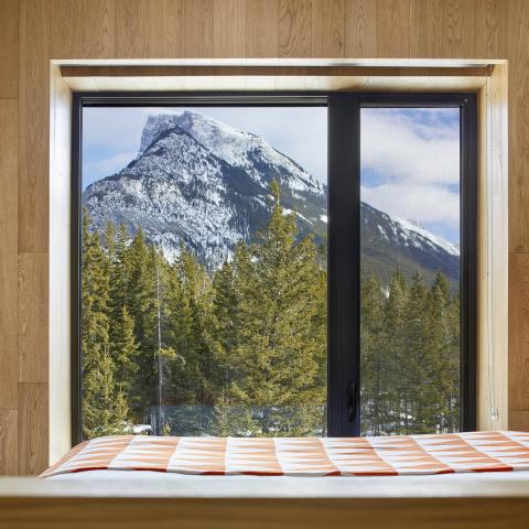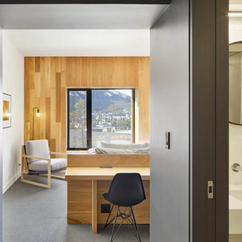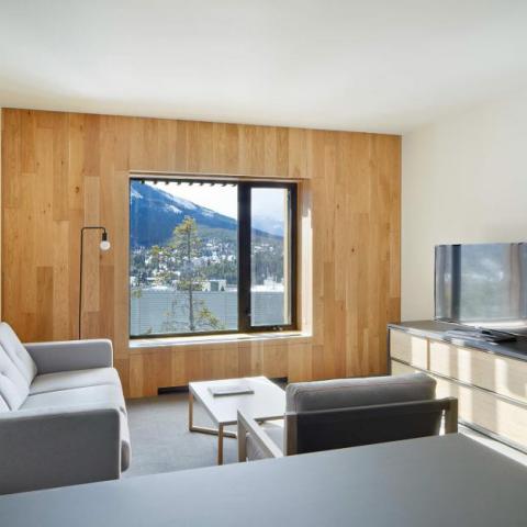Lloyd Hall incorporates vertical cedar fins on the outside and white-oak paneling on the inside to nestle you into the mountains. The large and unobstructed windows are your gateway to spectacular mountain vistas. The hotel is a living gallery, with Banff Centre resident artists showcased extensively within the rooms.