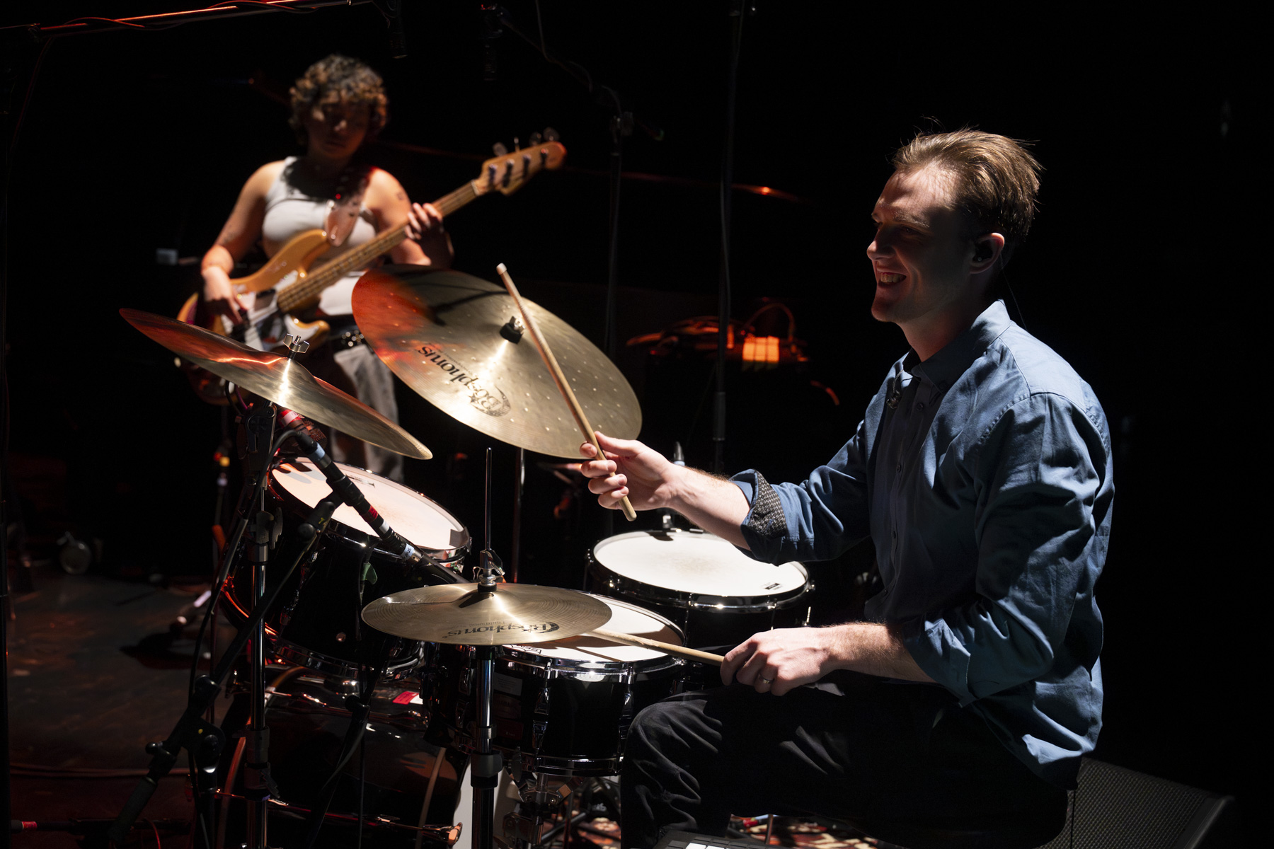 Jazz and Sonic Arts Concert, 2025. L to R: Gabriela Laconsay (electric bass) and Ryan Daunt (Drums). Photo by Abigaile Edwards.
