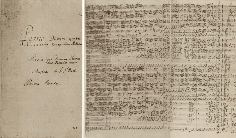 Johann Sebastian Bach, Matthäuspassion BWV 244. Title page of the autograph score and the crop of the last measures of movement 1 and start of movement 2.